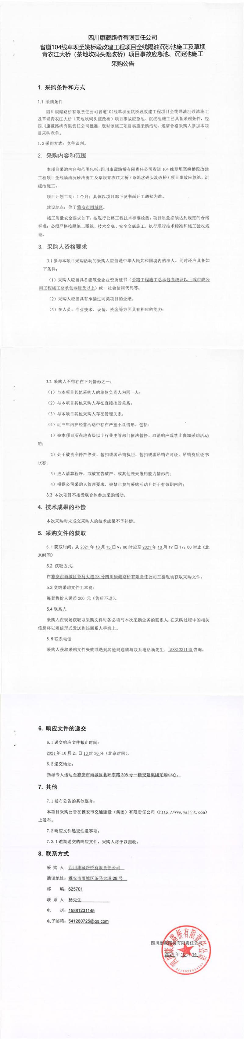 四川康藏路橋有限責任公司省道104線草壩至姚橋段改建項目全線隔油沉砂池施工及草壩青衣江大橋(茶地坎碼頭渡改橋)項目事故應急池、沉淀池施工采購公告