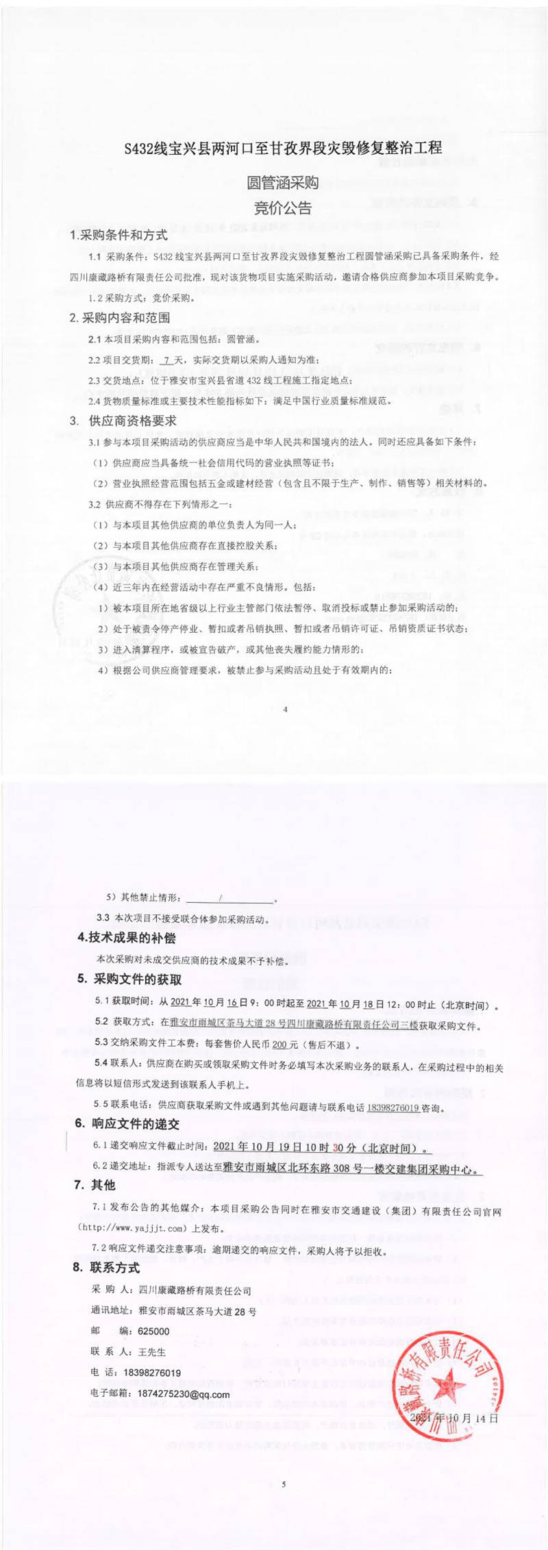 四川康藏路橋有限責(zé)任公司S432線寶興縣兩河口至甘孜界段災(zāi)毀修復(fù)整治工程圓管涵采購競價公告