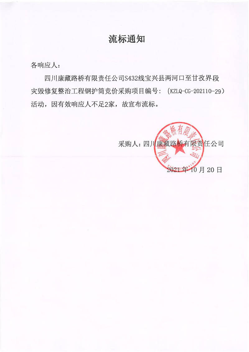 四川康藏路橋有限責(zé)任公司S432線寶興縣兩河口至甘孜界段災(zāi)毀修復(fù)整治工程鋼護筒競價采購流標(biāo)通知