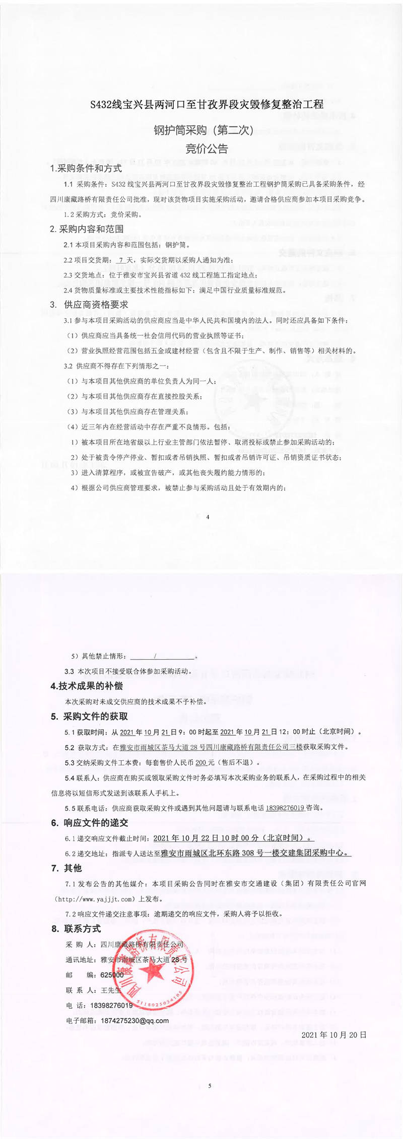 四川康藏路橋有限責任公司S432線寶興縣兩河口至甘孜界段災毀修復整治工程鋼護筒采購(第二次)競價公告