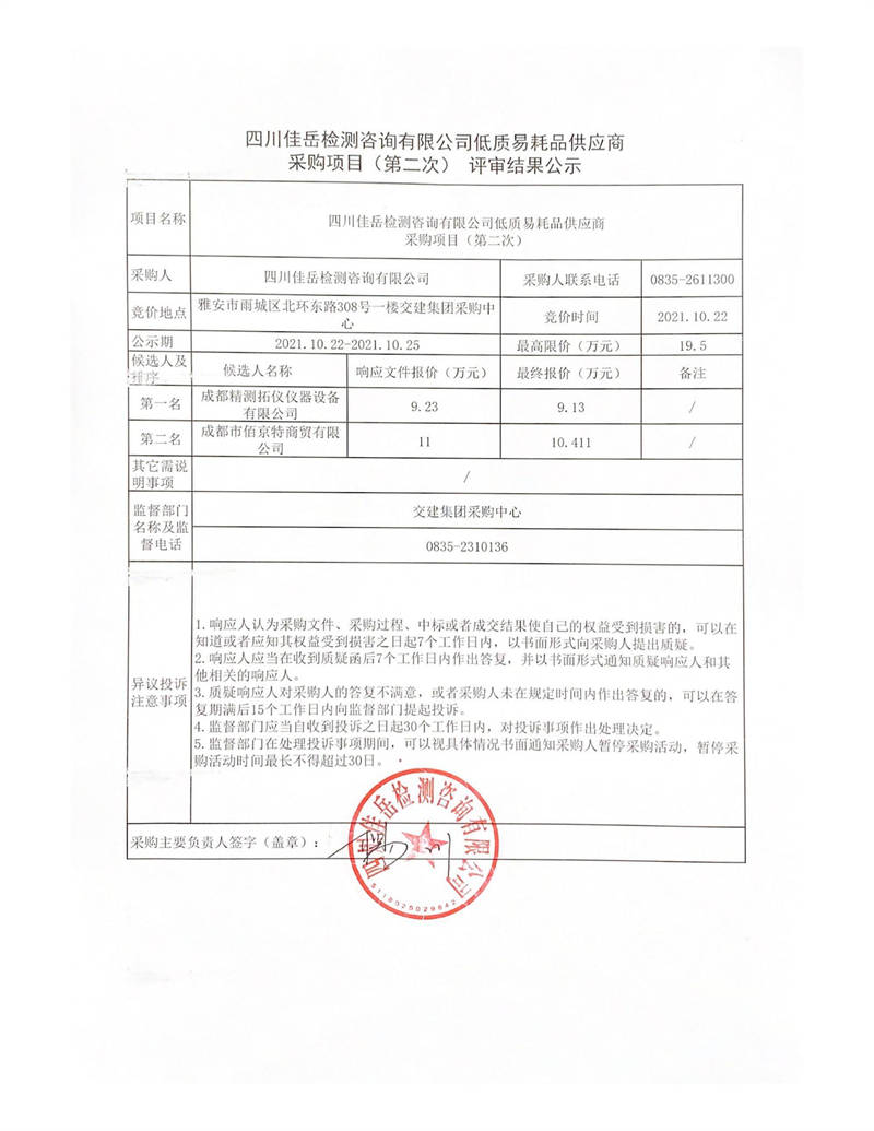 四川佳岳檢測(cè)咨詢(xún)有限公司低質(zhì)易耗品供應(yīng)商采購(gòu)項(xiàng)目(第二次)評(píng)審結(jié)果公示