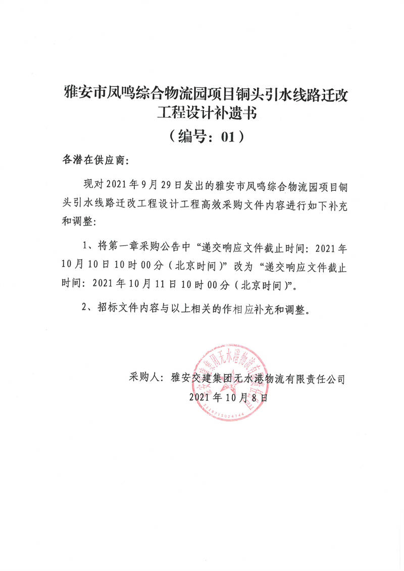 雅安交建集團無水港物流有限責(zé)任公司雅安市鳳鳴綜合物流園項目銅頭引水線路遷改工程設(shè)計補遺書