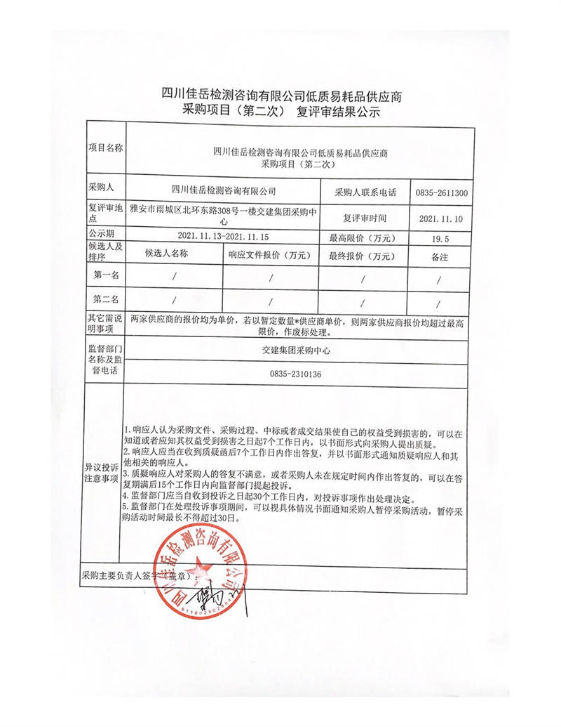四川佳岳檢測咨詢有限公司低質(zhì)易耗品供應(yīng)商采購項目(第二次)復評審結(jié)果公示