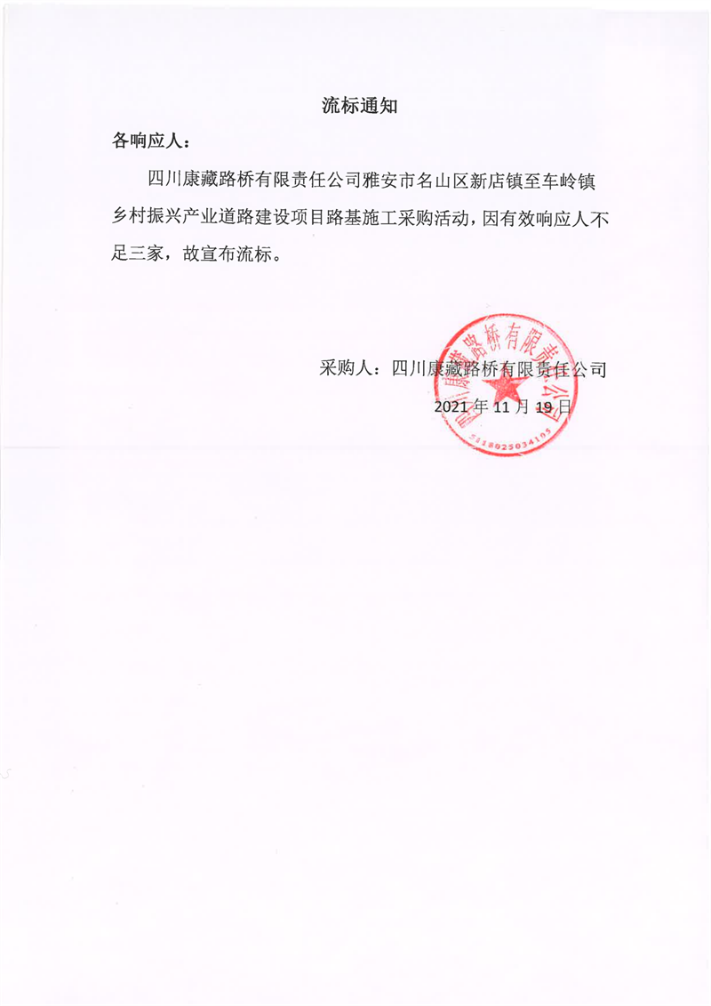 四川康藏路橋有限責(zé)任公司雅安市名山區(qū)新店鎮(zhèn)至車嶺鎮(zhèn)鄉(xiāng)村振興產(chǎn)業(yè)道路建設(shè)項(xiàng)目路面施工采購(gòu)流標(biāo)通知