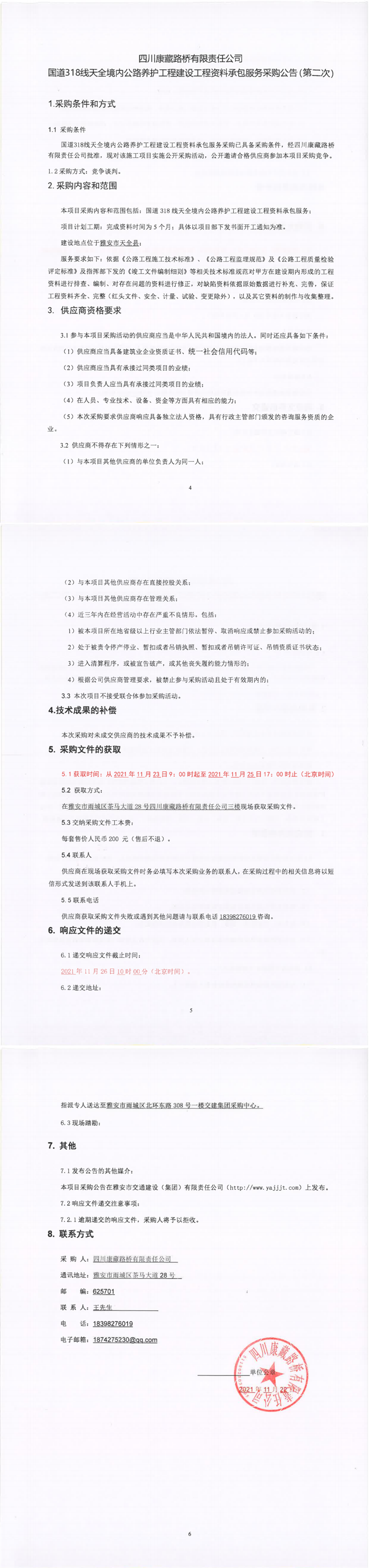 四川康藏路橋有限責任公司國道318線天全境內(nèi)公路養(yǎng)護工程建設工程資料承包服務采購公告(第二次)
