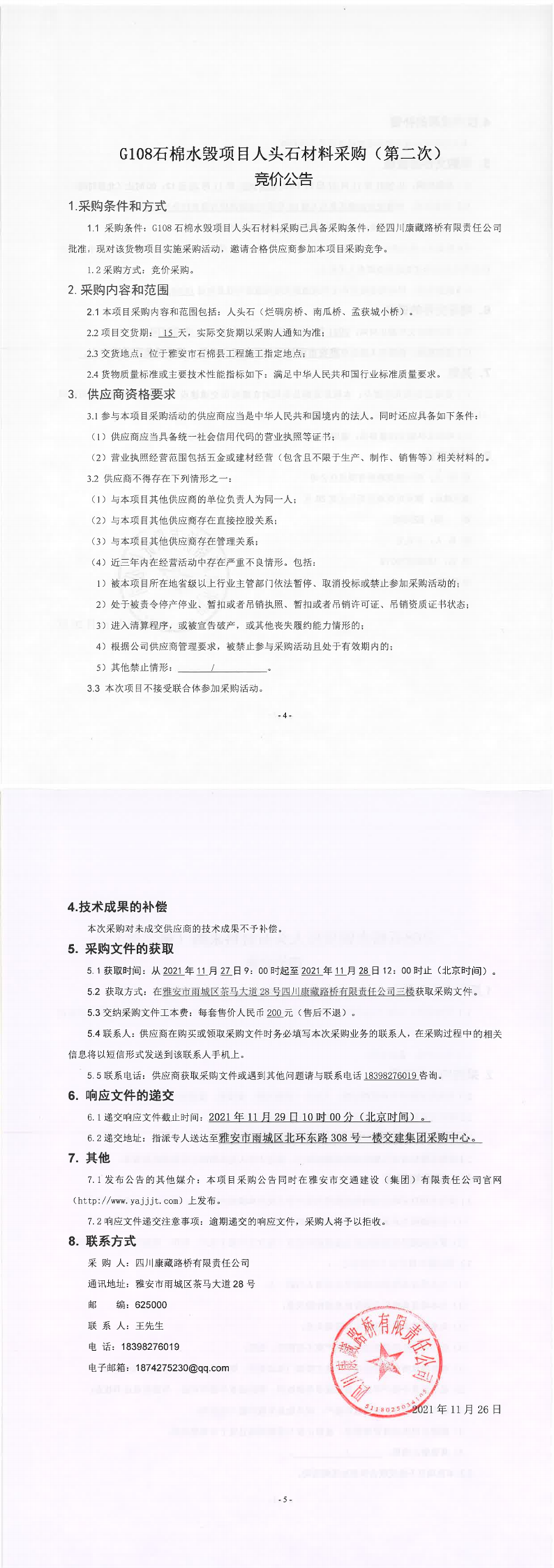 四川康藏路橋有限責(zé)任公司G108石棉水毀項(xiàng)目人頭石材料采購(第二次)競(jìng)價(jià)公告