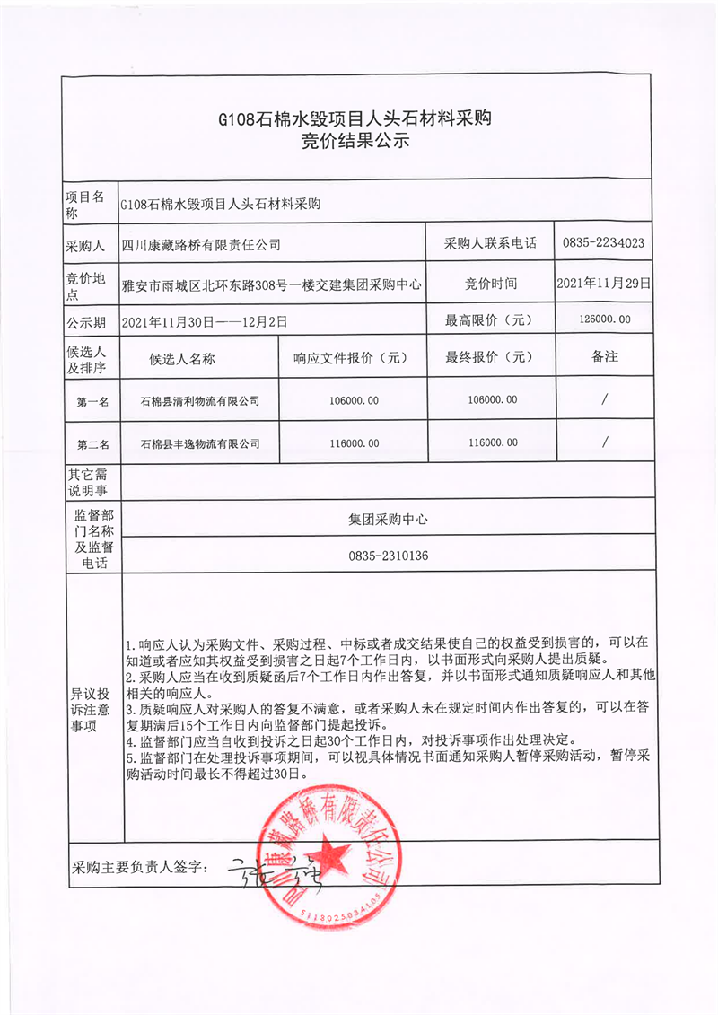 四川康藏路橋有限責(zé)任公司G108石棉水毀項(xiàng)目人頭石材料采購競(jìng)價(jià)結(jié)果公示