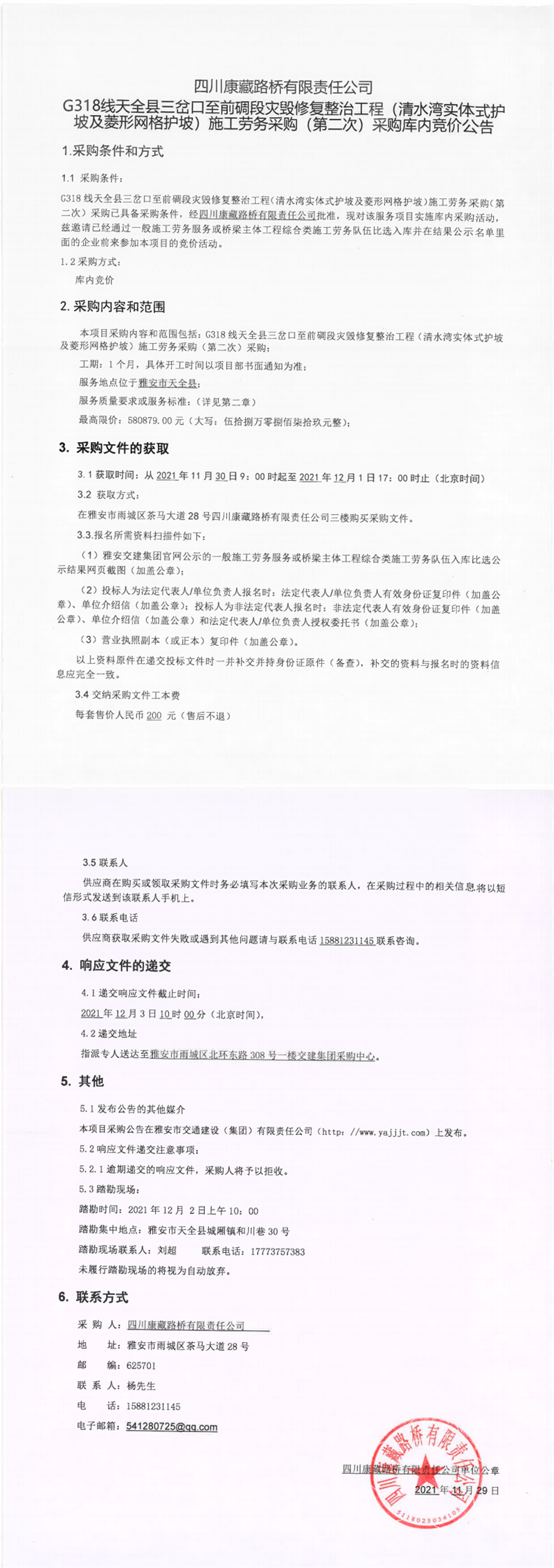 四川康藏路橋有限責(zé)任公司G318線天全縣三岔口至前碉段災(zāi)毀修復(fù)整治工程(清水灣實(shí)體式護(hù)坡及菱形網(wǎng)護(hù)坡)施工勞務(wù)采購(第二次)采購庫內(nèi)競(jìng)價(jià)公告
