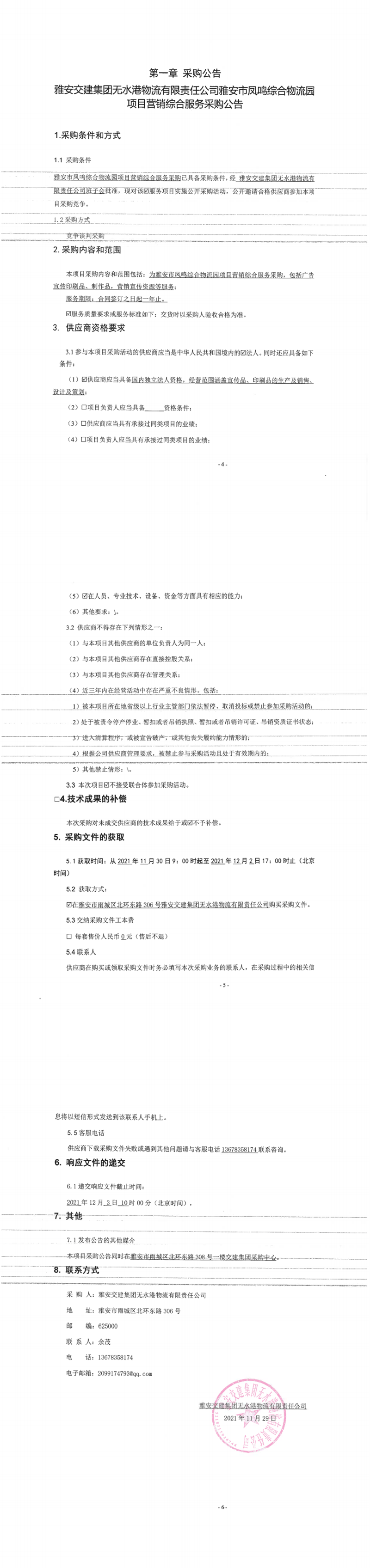 雅安交建集團(tuán)無水港物流有限責(zé)任公司雅安市鳳鳴綜合物流園項(xiàng)目營(yíng)銷綜合服務(wù)采購(gòu)公告