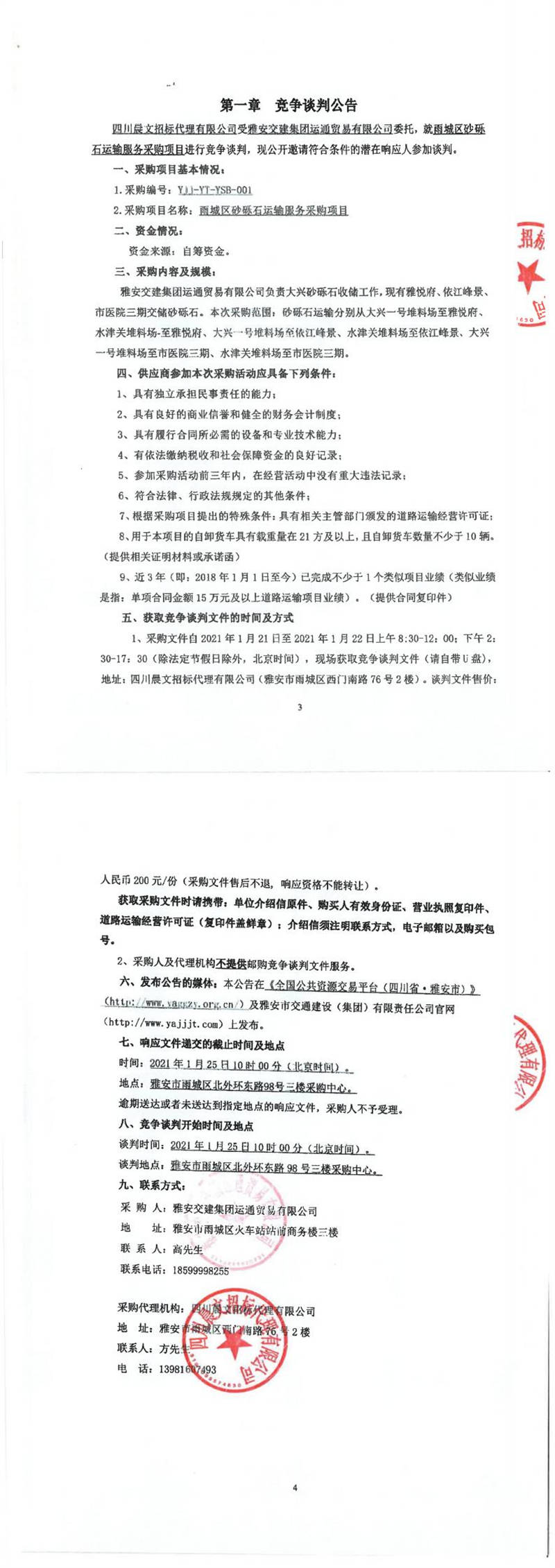 雅安交建集團運通貿(mào)易有限公司雨城區(qū)砂礫石運輸服務采購項目競爭談判公告