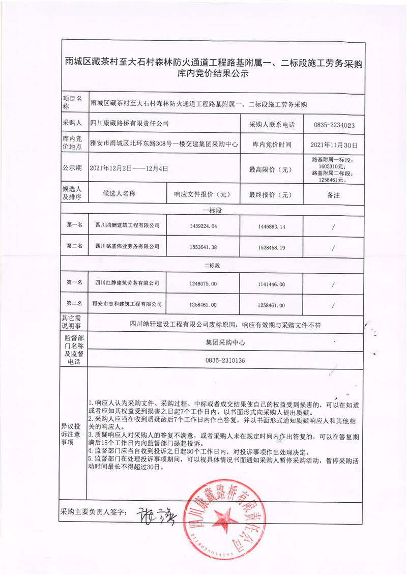 四川康藏路橋有限責任公司雨城區(qū)藏茶村至大石村森林防火通道工程路基附屬一、二標段施工勞務采購庫內競價結果公示