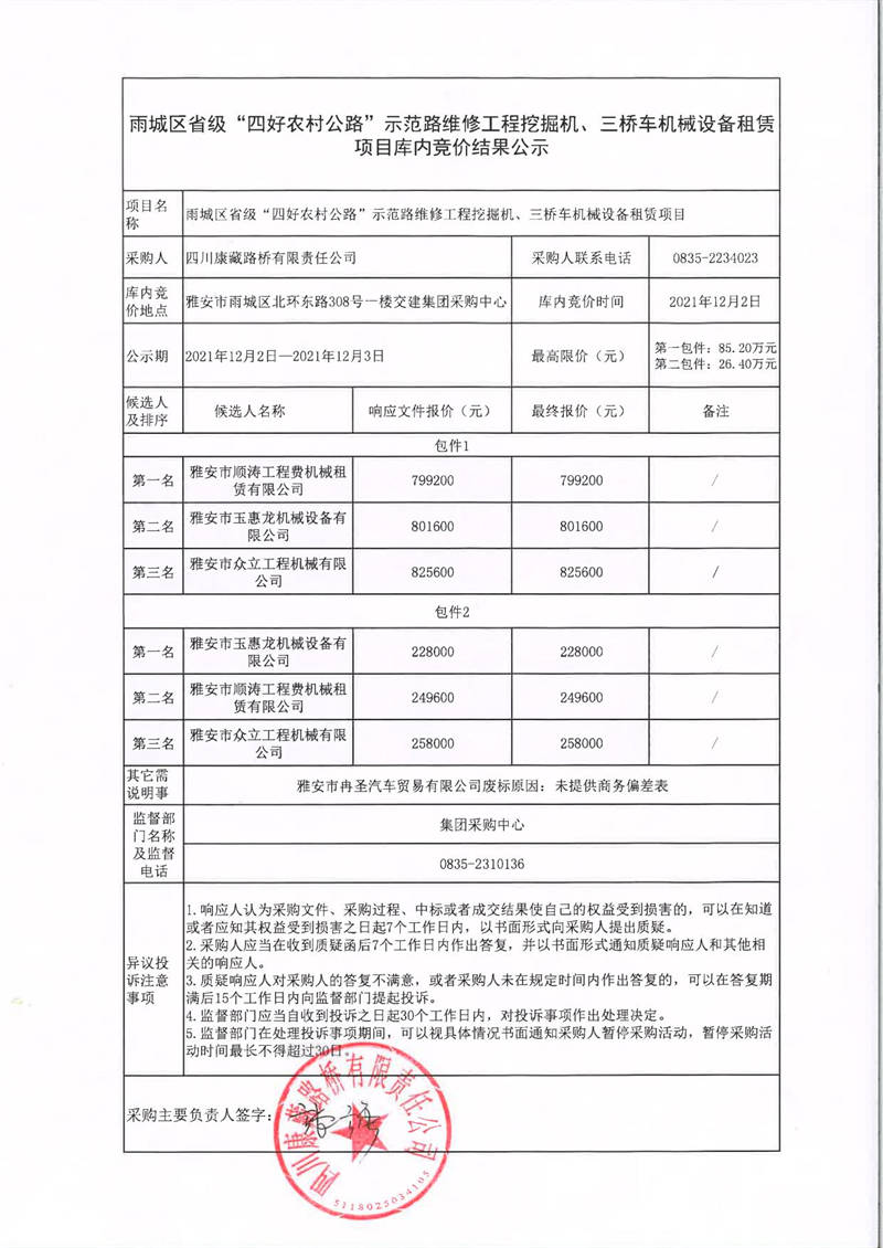 四川康藏路橋有限責任公司雨城區(qū)省級“四好農(nóng)村路”示范路維修工程挖掘機、三橋車機械設備租賃項目庫內競價結果公示