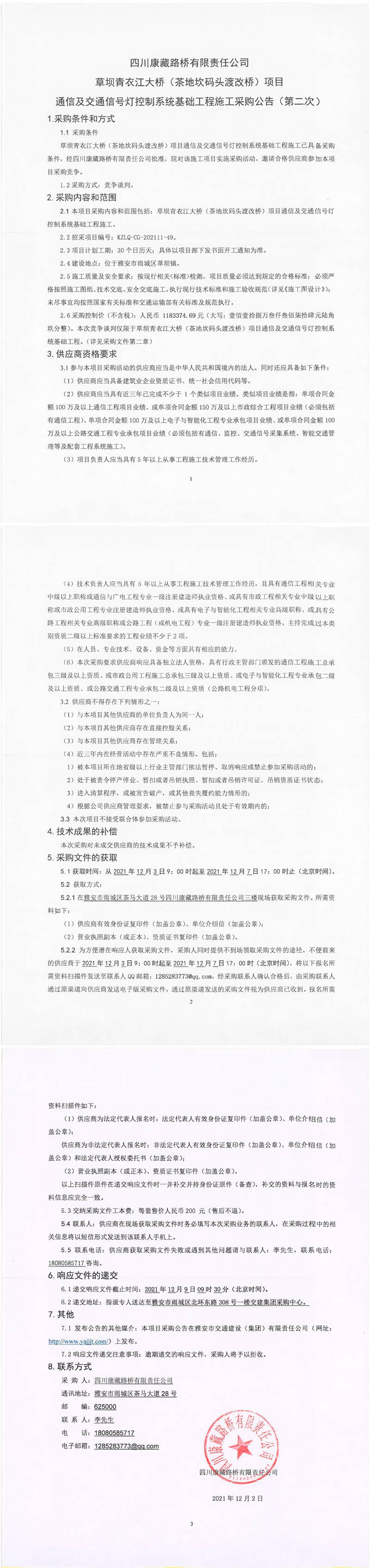 四川康藏路橋有限責(zé)任公司草壩青衣江大橋(茶地坎碼頭渡改橋)項(xiàng)目通信及交通信號(hào)燈控制系統(tǒng)基礎(chǔ)工程施工采購(gòu)公告(第二次)