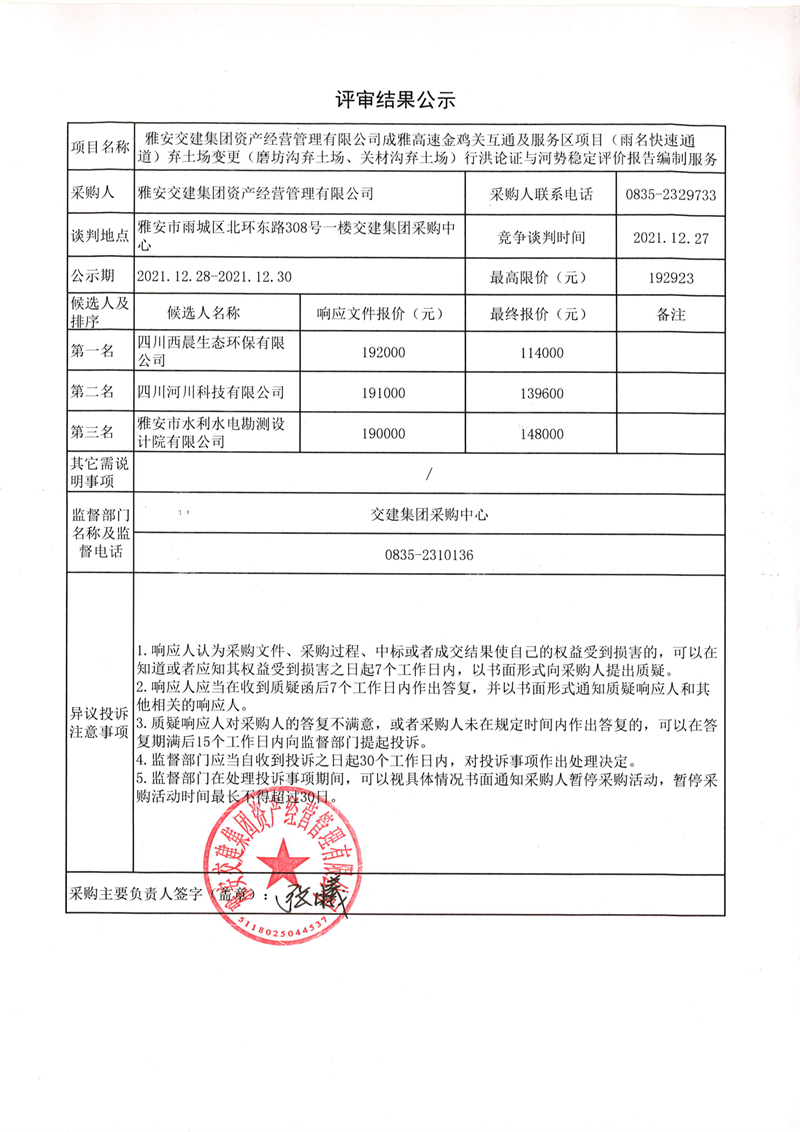 雅安交建集團資產(chǎn)經(jīng)營管理有限公司成雅高速金雞關(guān)互通及服務(wù)區(qū)項目(雨名快速通道)棄土場變更(磨坊溝棄土場、關(guān)材溝棄土場)行洪論證與河勢穩(wěn)定評價報告編制服務(wù)評審結(jié)果公示