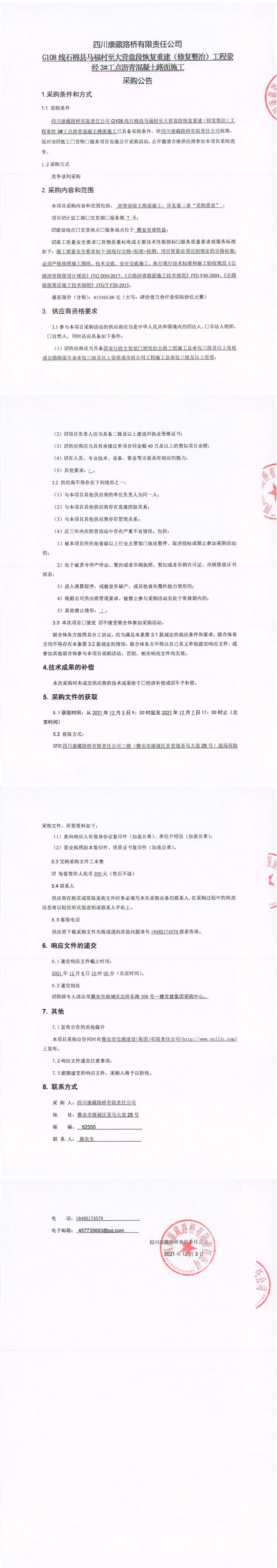 四川康藏路橋有限責(zé)任公司G108線石棉縣馬福村至大營盤段恢復(fù)重建(修復(fù)整治)工程滎經(jīng)3#工點瀝青混凝土路面施工采購公告