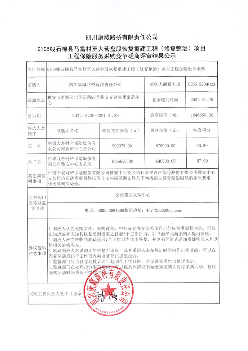 四川康藏路橋有限責任公司G108線石棉縣馬富村至大營盤段恢復(fù)重建工程(修復(fù)整治)項目工程保險服務(wù)采購競爭磋商評審結(jié)果公示