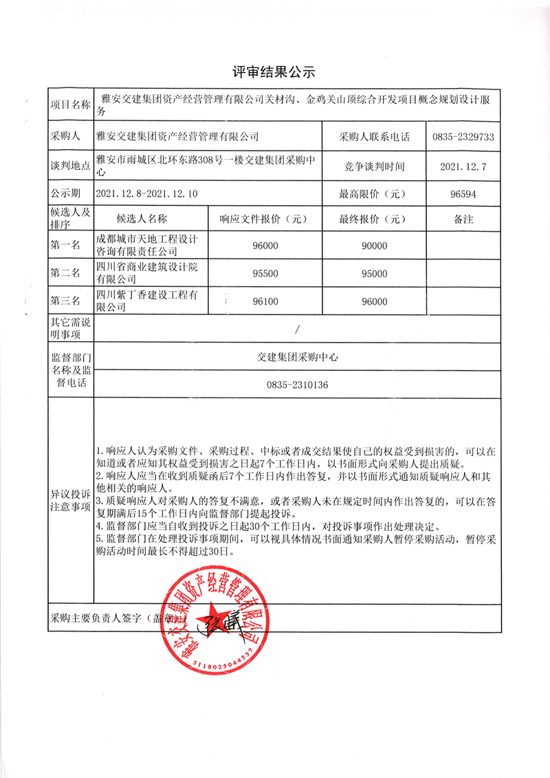 雅安交建集團(tuán)資產(chǎn)經(jīng)營管理有限公司關(guān)材溝、金雞關(guān)山頂綜合開發(fā)項目概念規(guī)劃設(shè)計服務(wù)評審結(jié)果公示