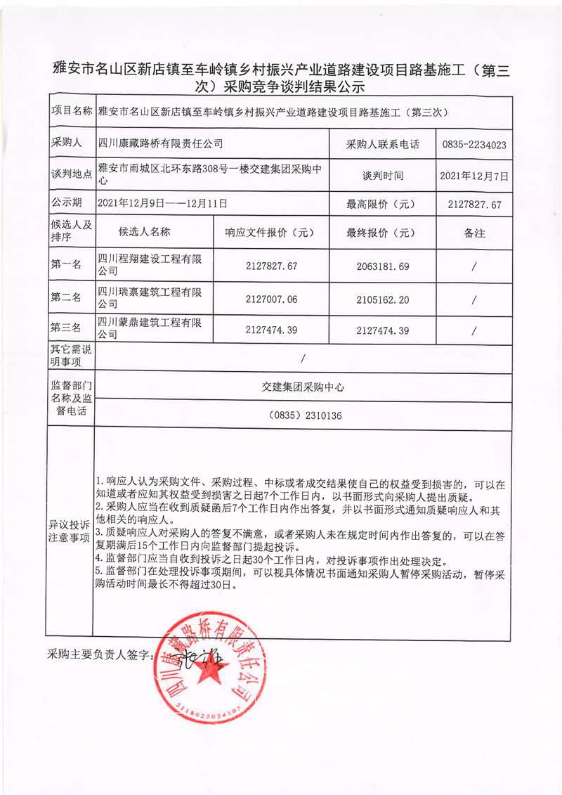 四川康藏路橋有限責(zé)任公司雅安市名山區(qū)新店鎮(zhèn)至車(chē)嶺鎮(zhèn)鄉(xiāng)村振興產(chǎn)業(yè)道路建設(shè)項(xiàng)目路面施工(第三次)采購(gòu)競(jìng)爭(zhēng)談判結(jié)果公示