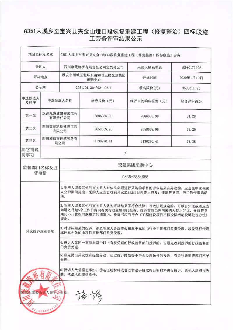 四川康藏路橋有限責(zé)任公司G351大溪鄉(xiāng)至寶興縣夾金山埡口段恢復(fù)重建工程(修復(fù)整治)四標段施工勞務(wù)評審結(jié)果公示