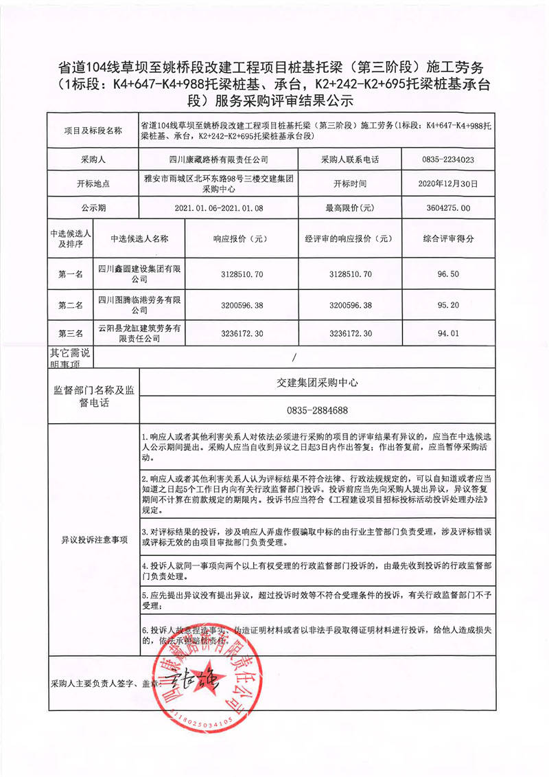 四川康藏路橋有限責任公司省道104線草壩至姚橋段改建工程項目樁基托梁(第三階段)施工勞務服務1標段采購評審結果公示