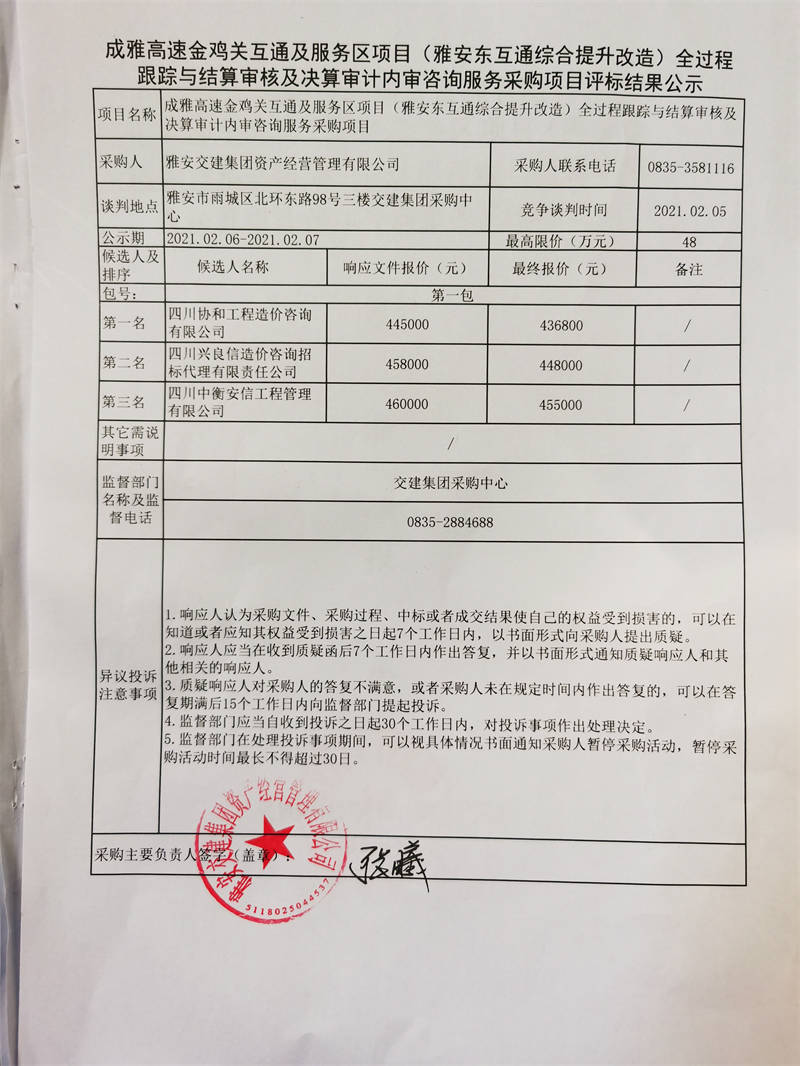 雅安交建集團資產(chǎn)經(jīng)營管理有限公司成雅高速金雞關(guān)互通及服務(wù)區(qū)項目(雅安東互通綜合提升改造)全過程跟蹤與結(jié)算審核及決算審計內(nèi)審咨詢服務(wù)評標結(jié)果公示