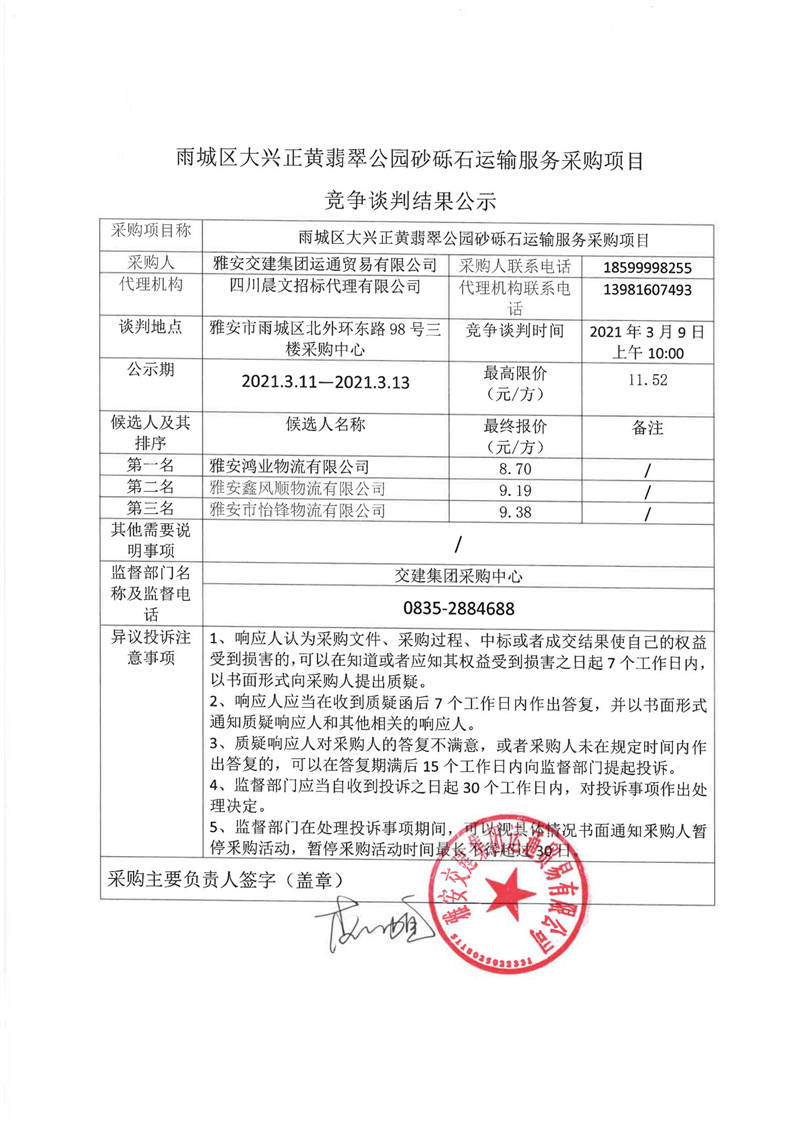 雅安交建集團(tuán)運(yùn)通貿(mào)易有限公司雨城區(qū)大興正黃翡翠公園砂礫石運(yùn)輸服務(wù)采購項(xiàng)目競(jìng)爭(zhēng)談判結(jié)果公示