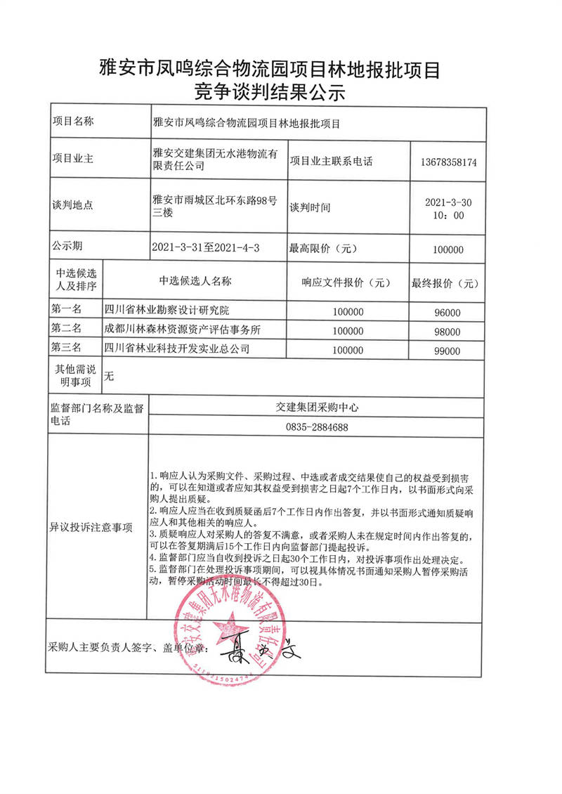 雅安交建集團(tuán)無水港物流有限責(zé)任公司雅安市鳳鳴綜合物流園項(xiàng)目林地報(bào)批項(xiàng)目競(jìng)爭(zhēng)談判結(jié)果公示