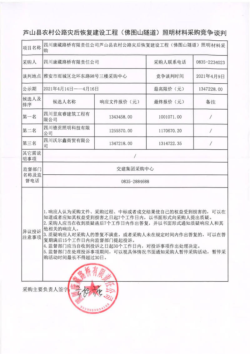 四川康藏路橋有限責(zé)任公司蘆山縣農(nóng)村公路災(zāi)后恢復(fù)建設(shè)工程(佛圖山隧道)照明材料采購(gòu)競(jìng)爭(zhēng)談判結(jié)果公示