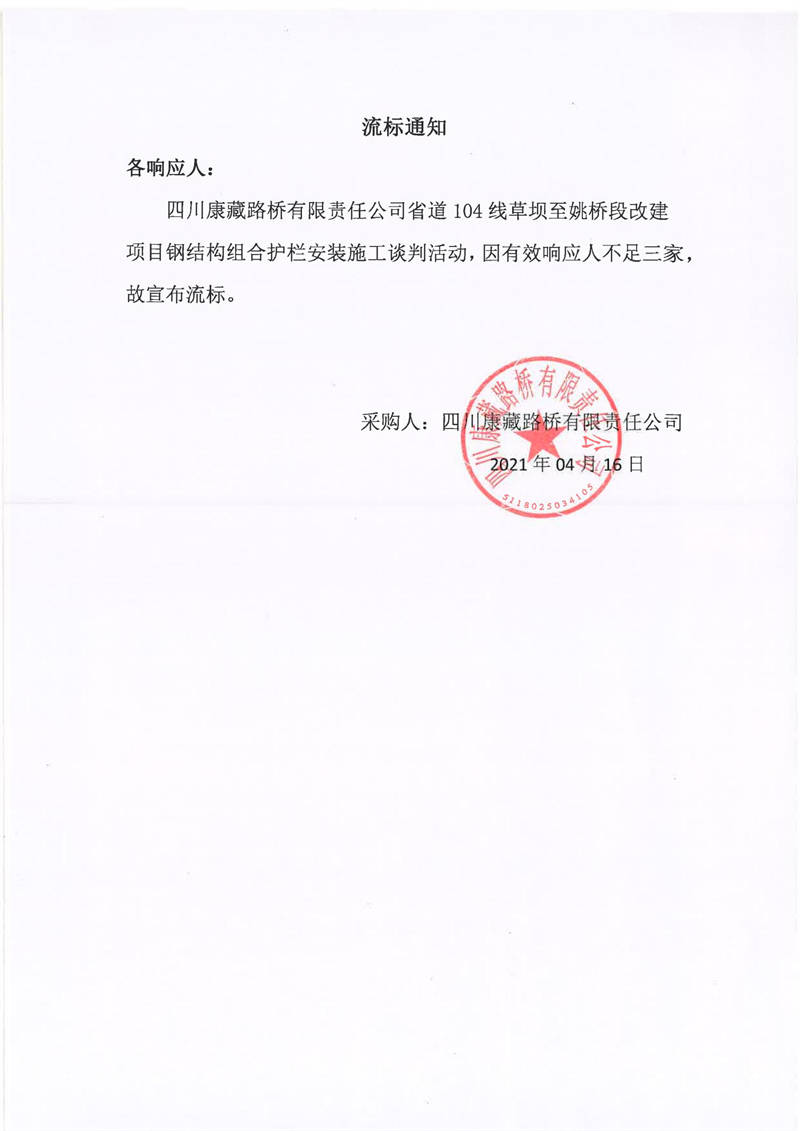 四川康藏路橋有限責(zé)任公司省道104線草壩至姚橋段改建項(xiàng)目鋼結(jié)構(gòu)組合護(hù)欄安裝施工流標(biāo)通知