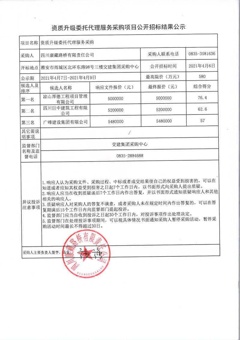 四川康藏路橋有限責(zé)任公司資質(zhì)升級(jí)委托代理服務(wù)采購項(xiàng)目公開招標(biāo)結(jié)果公示