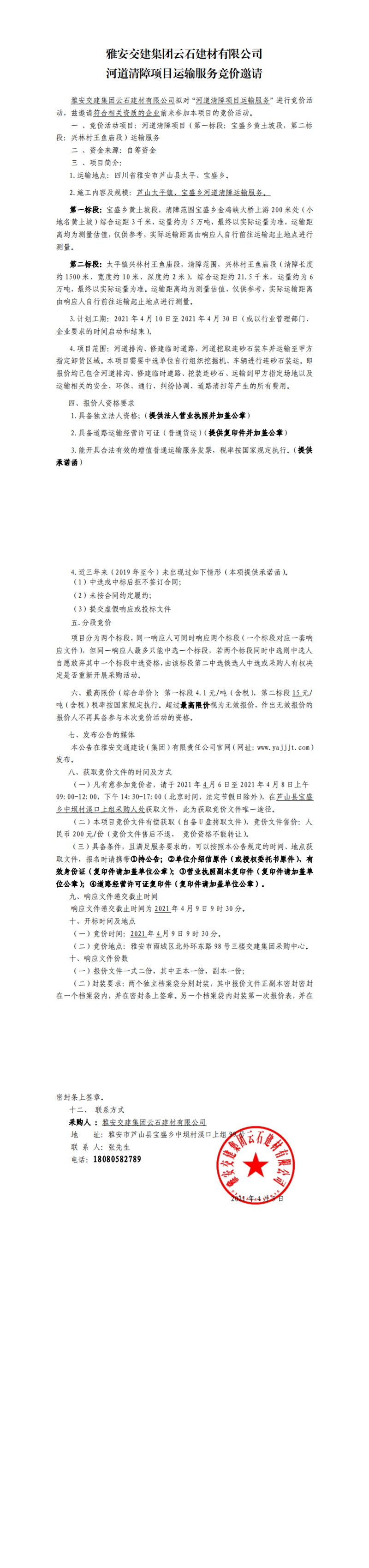 雅安交建集團(tuán)云石建材有限公司河道清障項目運(yùn)輸服務(wù)競價公告