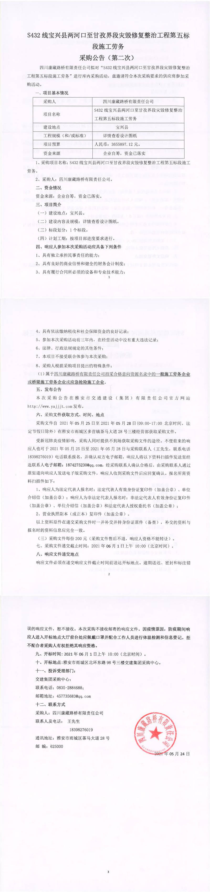 四川康藏路橋有限責(zé)任公司S432線(xiàn)寶興縣兩河口至甘孜界段災(zāi)毀修復(fù)整治工程第五標(biāo)段施工勞務(wù)采購(gòu)公告(第二次)