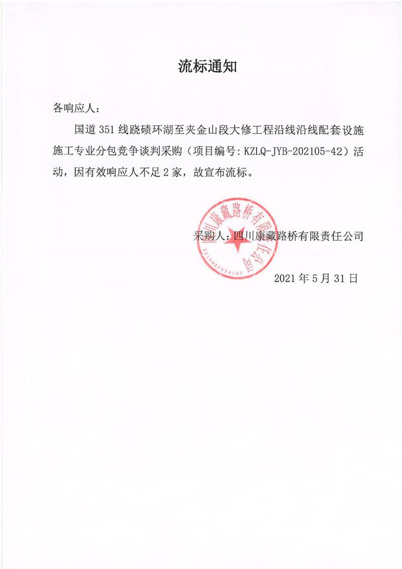 四川康藏路橋有限責(zé)任公司國道351線蹺磧環(huán)湖至夾金山段大修工程沿線沿線配套設(shè)施施工專業(yè)分包競(jìng)爭(zhēng)談判采購流標(biāo)通知
