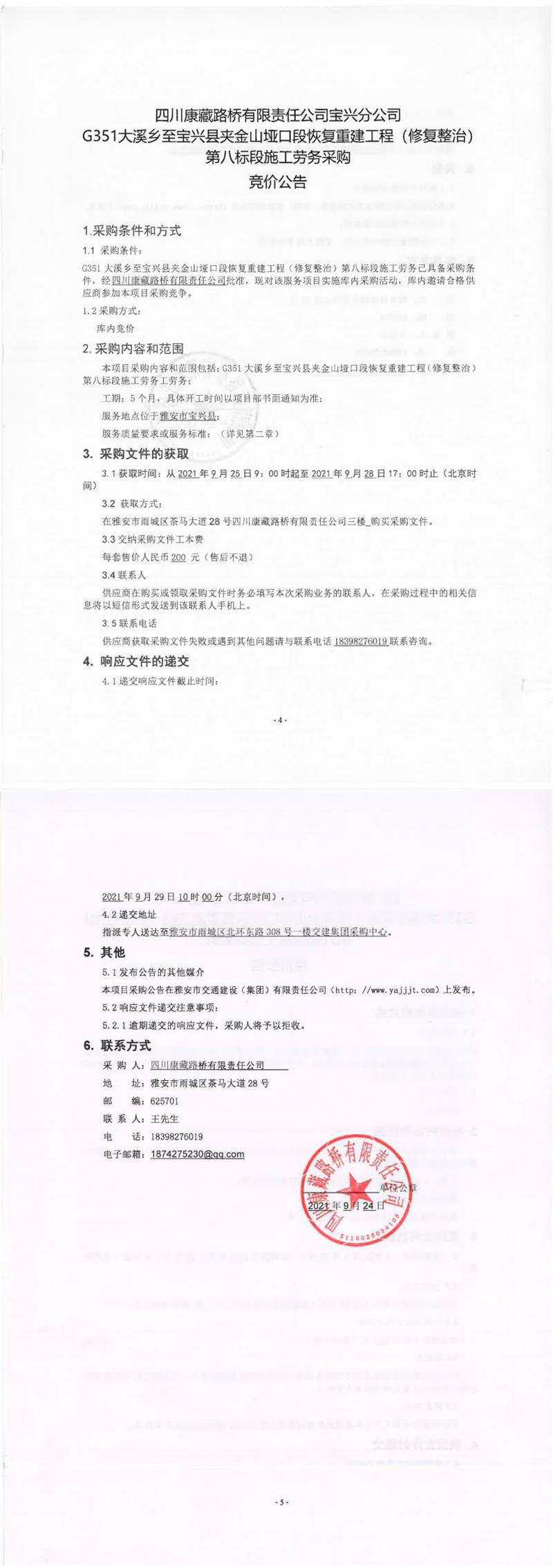 四川康藏路橋有限責任公司寶興分公司G351大溪鄉(xiāng)至寶興縣夾金山埡口段恢復重建工程(修復整治)第八標段施工勞務采購競價公告