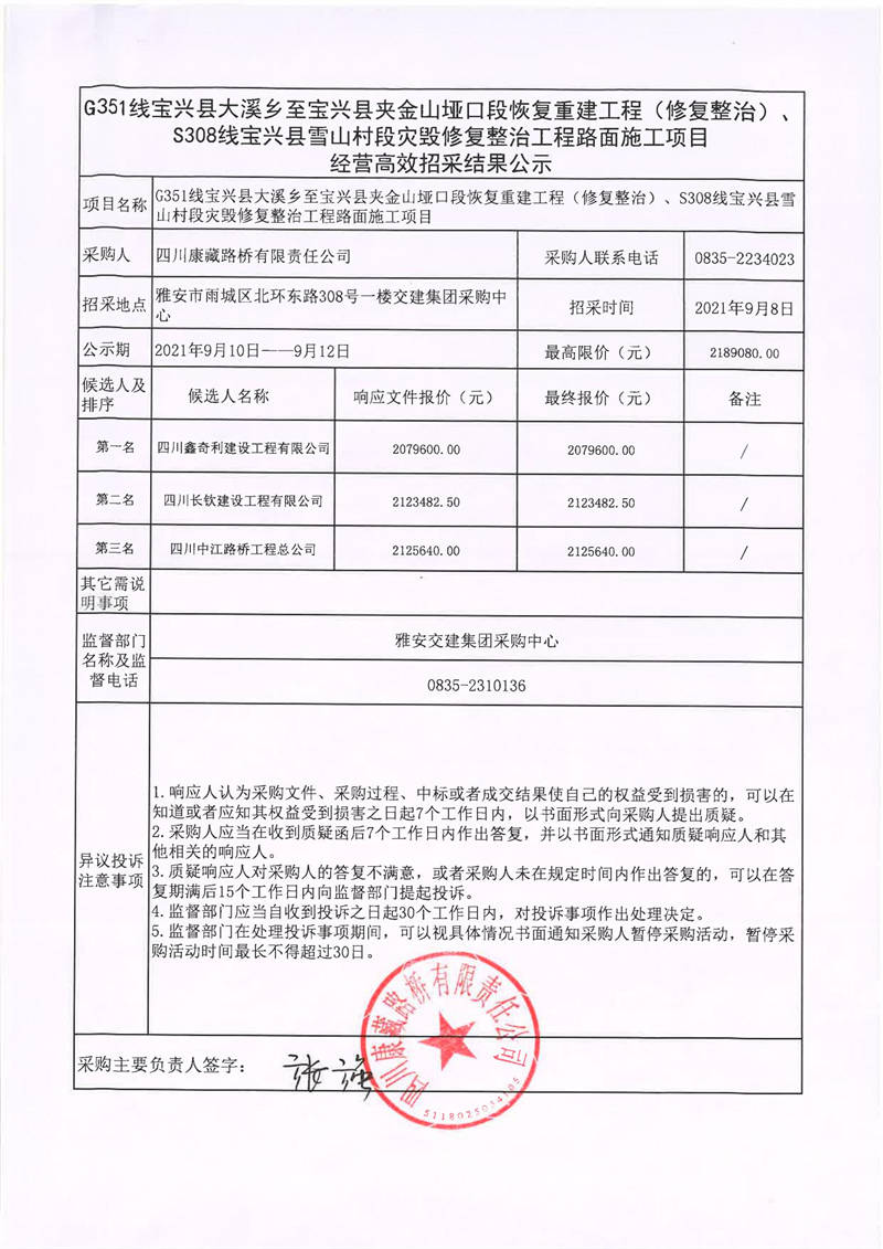 四川康藏路橋有限責任公司G351線寶興縣大溪鄉(xiāng)至寶興縣夾金山啞口段恢復(fù)重建工程(修復(fù)整治)、S308線寶興縣雪山村段災(zāi)毀修復(fù)整治工程路面施工項目經(jīng)營高效招采結(jié)果公示