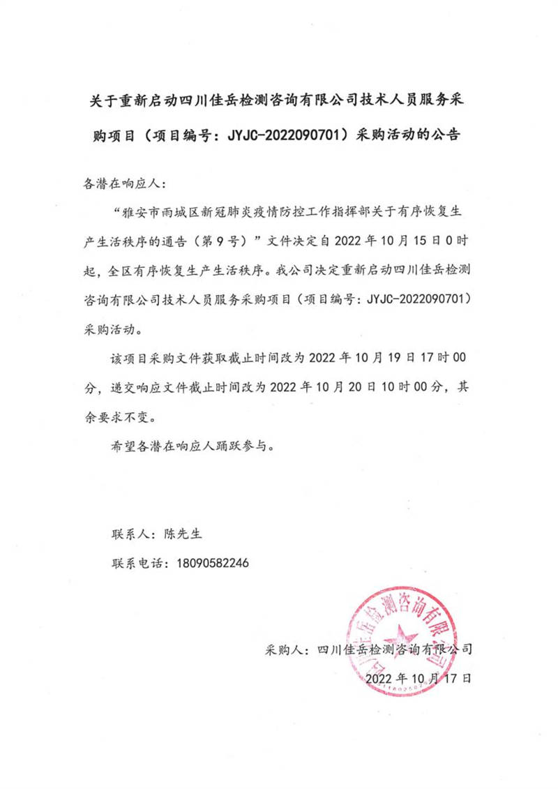 四川佳岳檢測(cè)咨詢有限公司關(guān)于重新啟動(dòng)四川佳岳檢測(cè)咨詢有限公司技術(shù)人員服務(wù)采購項(xiàng)目(項(xiàng)目編號(hào):JYJC-2022090701)采購活動(dòng)的公告