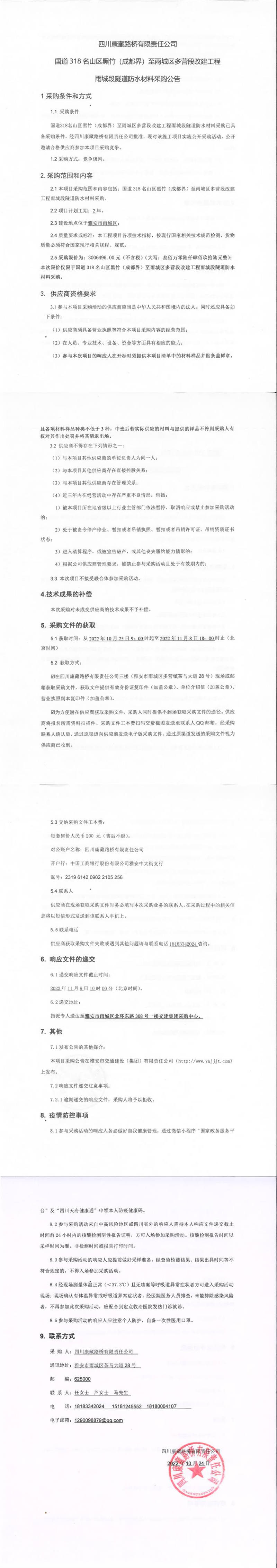 四川康藏路橋有限責(zé)任公司國道318名山區(qū)黑竹(成都界)至雨城區(qū)多營段改建工程雨城段隧道防水材料采購公告