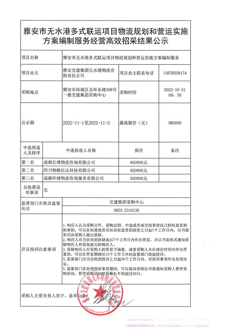 雅安交建集團無水港物流有限責任公司雅安市無水港多式聯(lián)運項目物流規(guī)劃和營運實施方案編制服務經(jīng)營高效招采結果公示