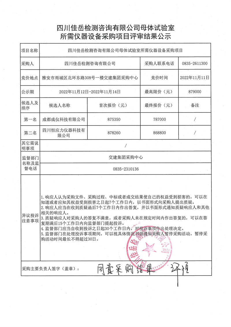 四川佳岳檢測咨詢有限公司母體試驗室所需儀器設(shè)備采購項目評審結(jié)果公示