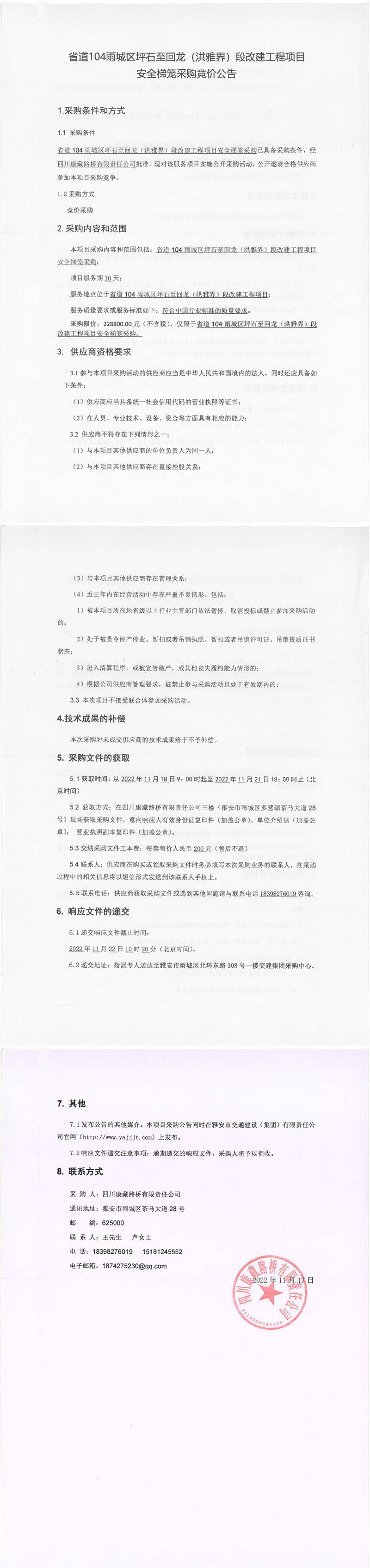 四川康藏路橋有限責(zé)任公司省道104雨城區(qū)坪石至回龍(洪雅界)段改建工程項(xiàng)目安全梯籠采購競價公告