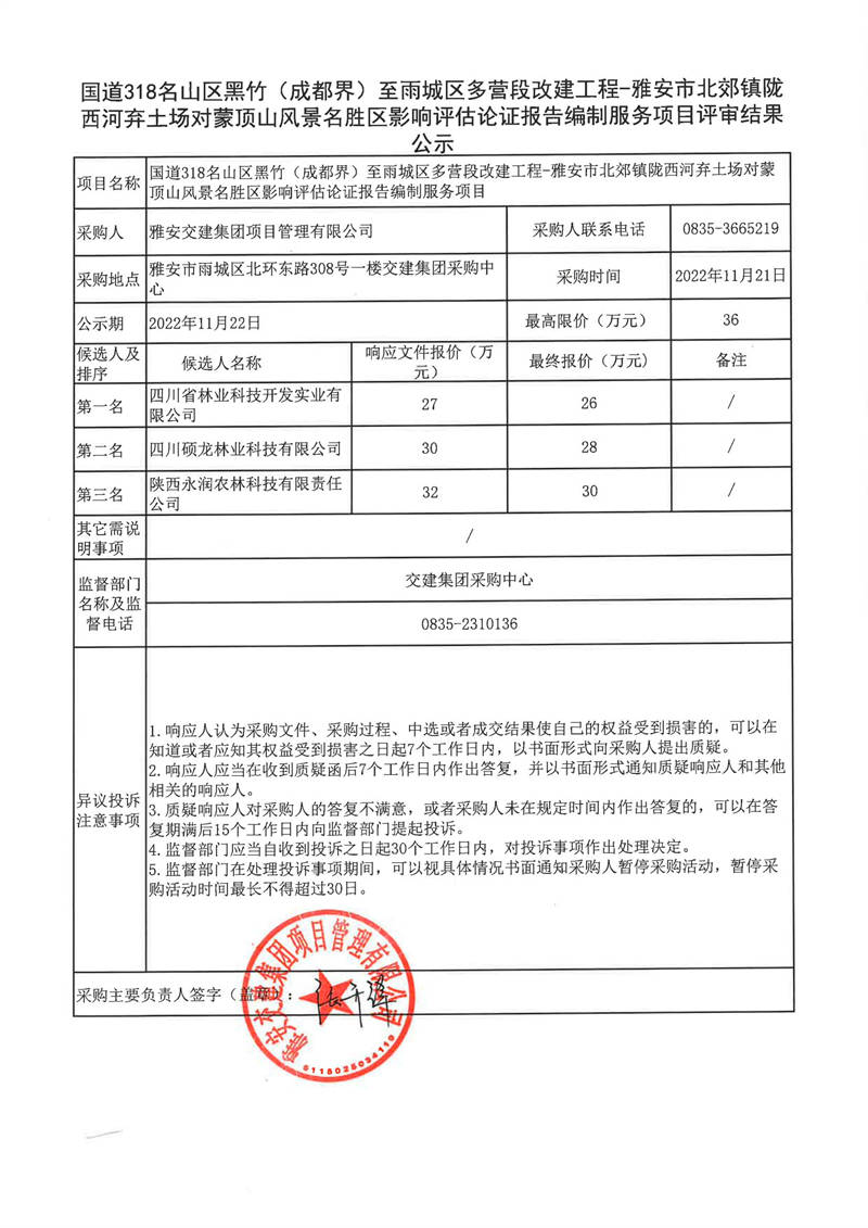 雅安交建集團(tuán)項(xiàng)目管理有限公司國道318名山區(qū)黑竹(成都界)至雨城區(qū)多營段改建工程-雅安市北郊鎮(zhèn)隴西河棄土場對蒙頂山風(fēng)景名勝區(qū)影響評估論證報(bào)告編制服務(wù)評審結(jié)果公示