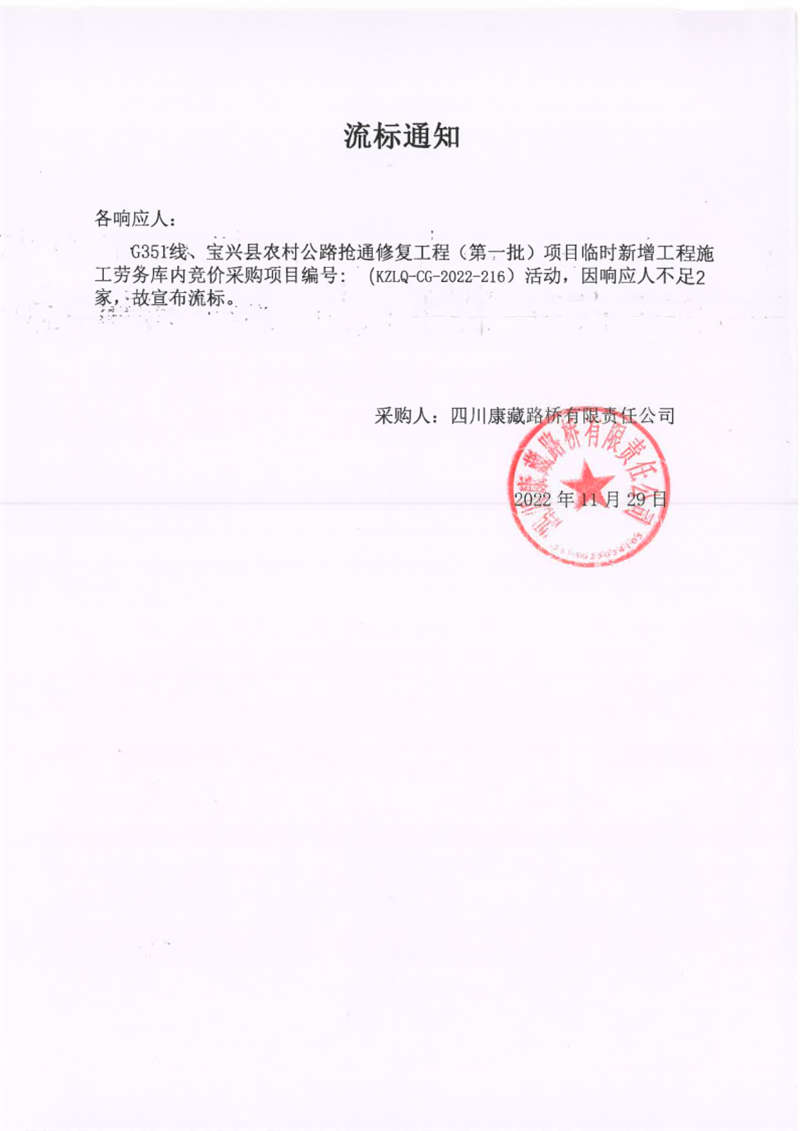 四川康藏路橋有限責(zé)任公司G351線、寶興縣農(nóng)村公路搶通修復(fù)工程(第一批)項(xiàng)目臨時新增工程施工勞務(wù)庫內(nèi)競價(jià)采購流標(biāo)通知