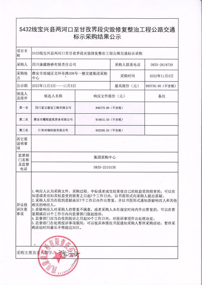 四川康藏路橋有限責任公司S432線寶興縣兩河口至甘孜界段災(zāi)毀修復(fù)整治工程公路交通標示采購結(jié)果公示