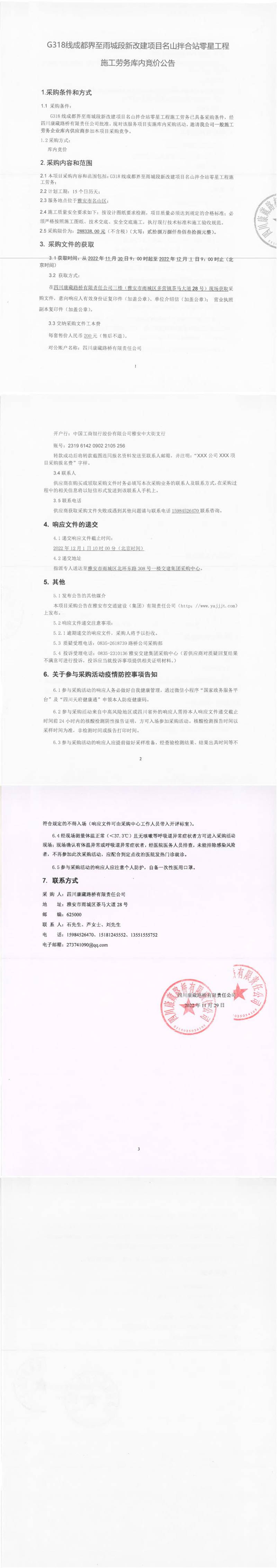 四川康藏路橋有限責(zé)任公司G318線成都界至雨城段新改建項目名山拌合站零星工程施工勞務(wù)庫內(nèi)競價公告