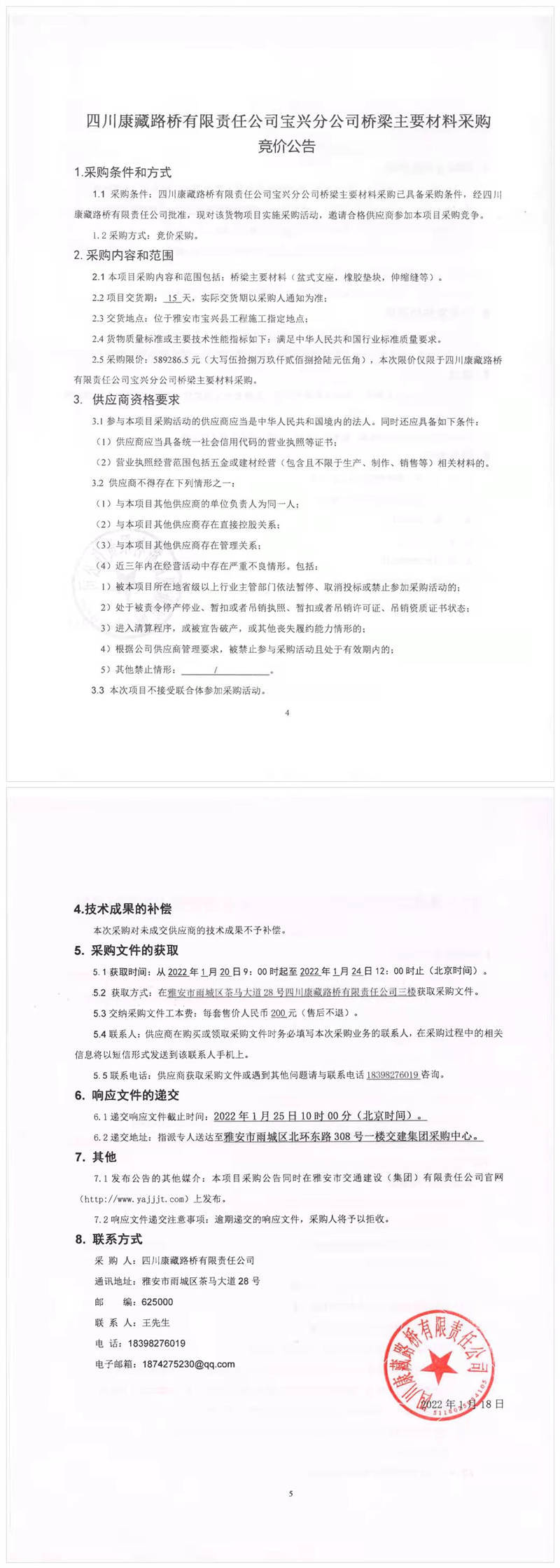 四川康藏路橋有限責(zé)任公司寶興分公司橋梁主要材料采購競(jìng)價(jià)公告
