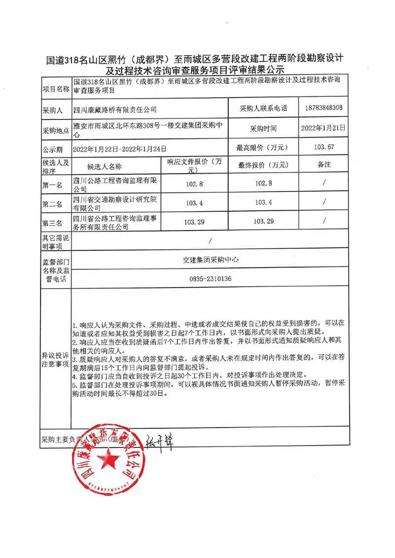 四川康藏路橋有限責(zé)任公司國(guó)道318名山區(qū)黑竹(成都界)至雨城區(qū)多營(yíng)段改建工程兩階段勘察設(shè)計(jì)及過程技術(shù)咨詢審查服務(wù)項(xiàng)目評(píng)審結(jié)果公示