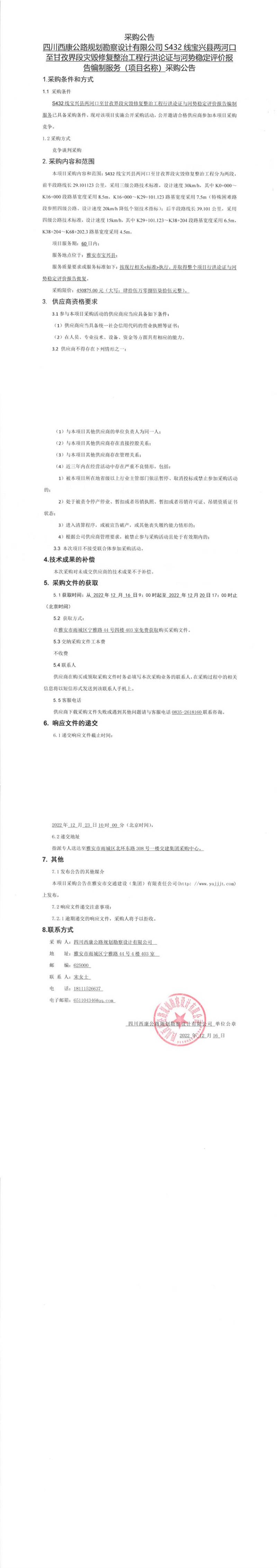 四川西康公路規(guī)劃勘察設(shè)計(jì)有限公司S432線寶興縣兩河口至甘孜界段災(zāi)毀修復(fù)整治工程行洪論證與河勢穩(wěn)定評價(jià)報(bào)告編制服務(wù)(項(xiàng)目名稱)采購公告