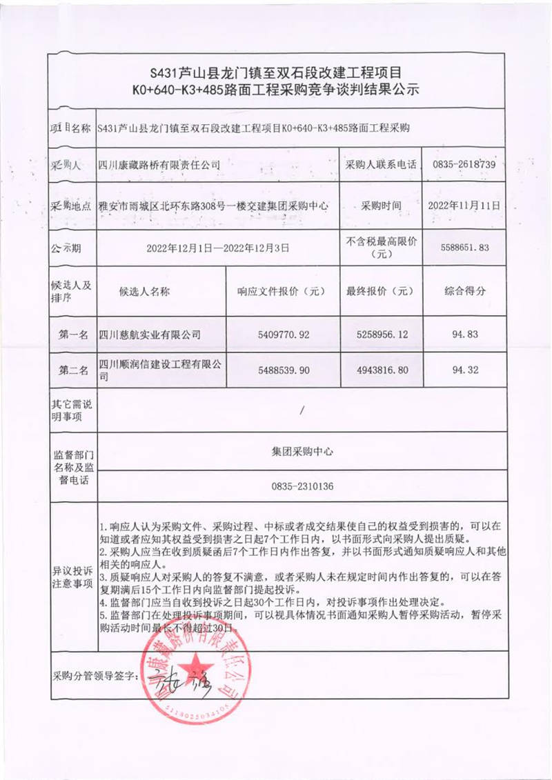 四川康藏路橋有限責(zé)任公司S431蘆山縣龍門鎮(zhèn)至雙石段改建工程項(xiàng)目K0+640-K3+485路面工程采購競爭談判結(jié)果公示