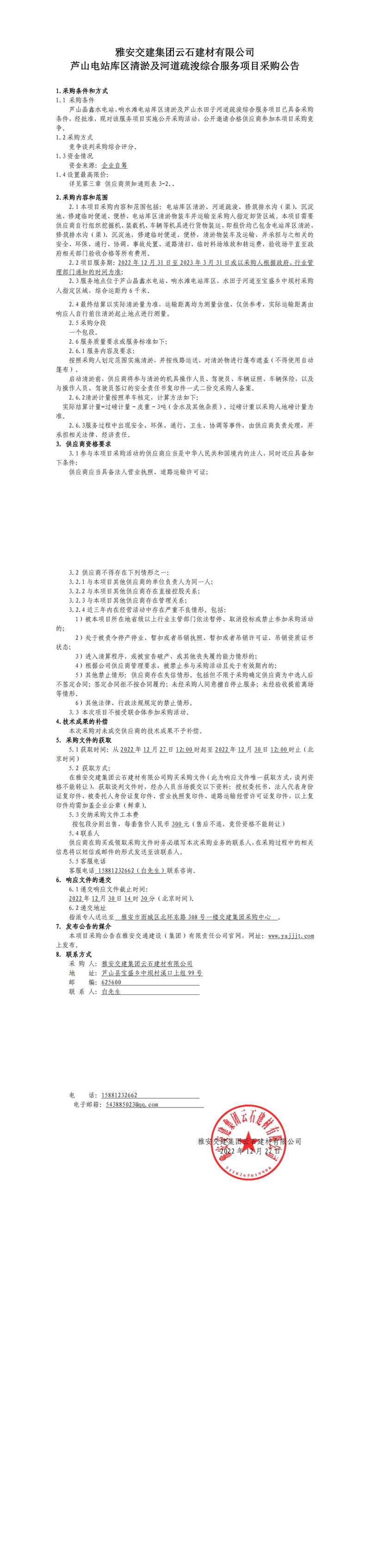 雅安交建集團(tuán)云石建材有限公司蘆山電站庫區(qū)清淤及河道疏浚綜合服務(wù)項(xiàng)目采購公告