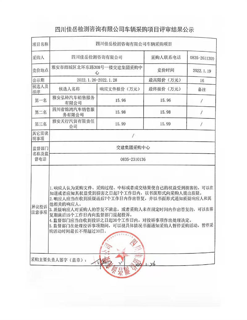 四川佳岳檢測(cè)咨詢有限公司車輛采購(gòu)項(xiàng)目評(píng)審結(jié)果公示